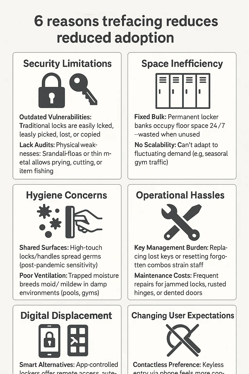 Vulnerabilidades obsoletas: las cerraduras tradicionales (llaves/marcadores combinados) se abren, se pierden o se copian fácilmente.