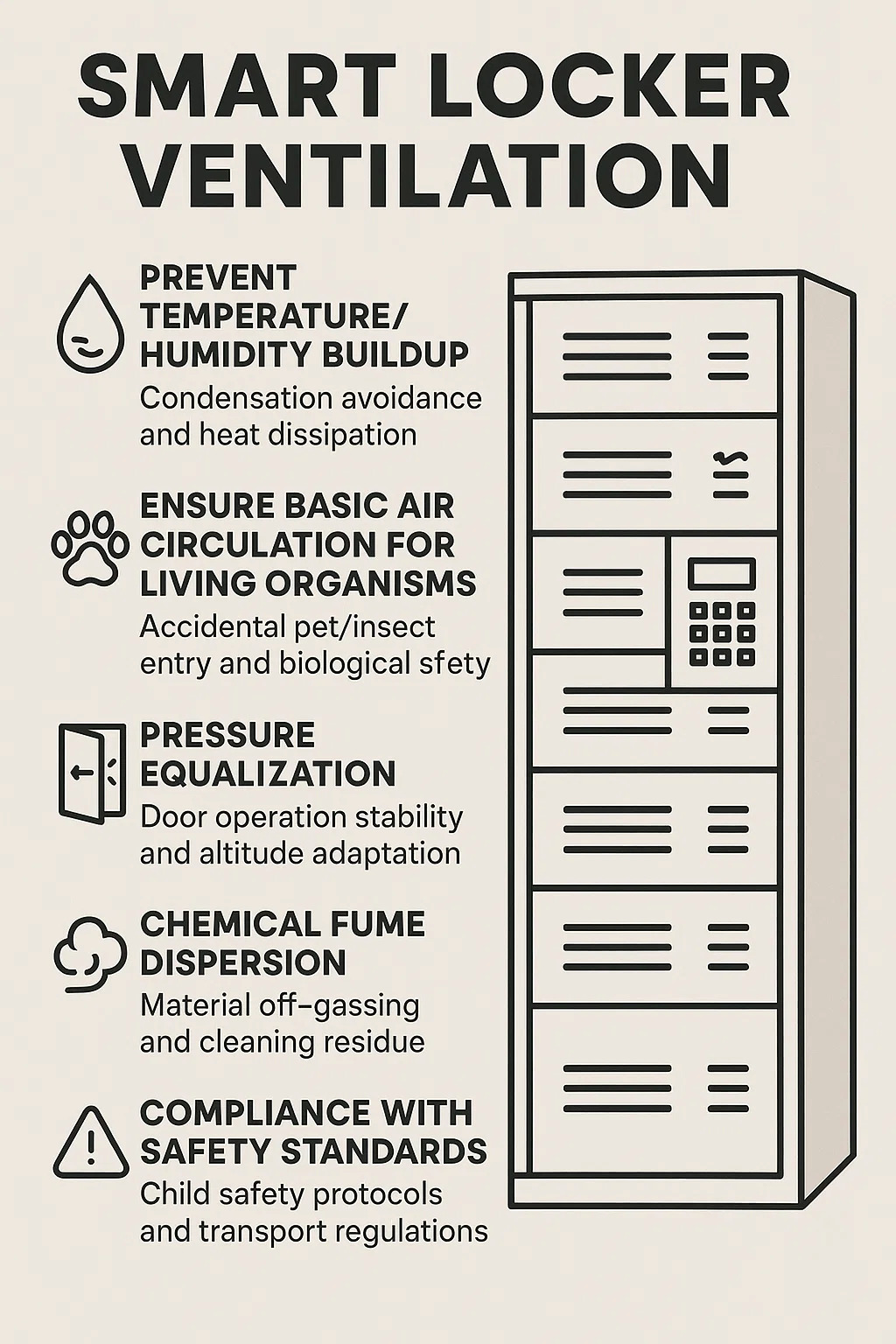 Entrada accidental de mascotas/insectos: los animales o insectos pequeños pueden ingresar a los casilleros durante la carga. La ventilación proporciona oxígeno para evitar la asfixia.
